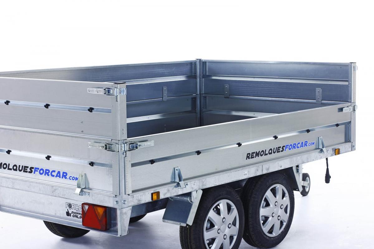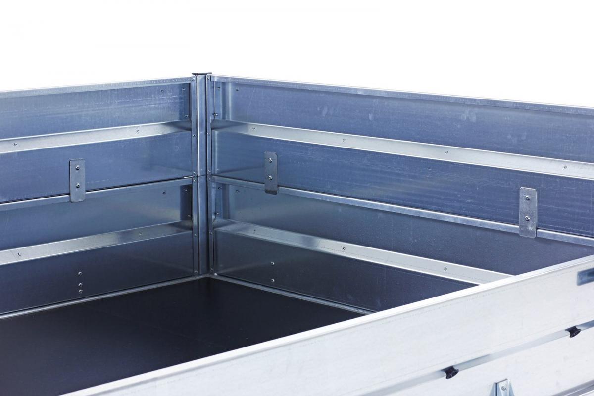 Con el juego de laterales de chapa para para el remolque basculante hidráulico POWERBOX ECO, fabricado en acero galvanizado, es una buena opción para lograr mucha más altura de caja. Con sus 30cm añadida a los 30cm de los laterales el remolque, se obtiene una altura total de 70cm.