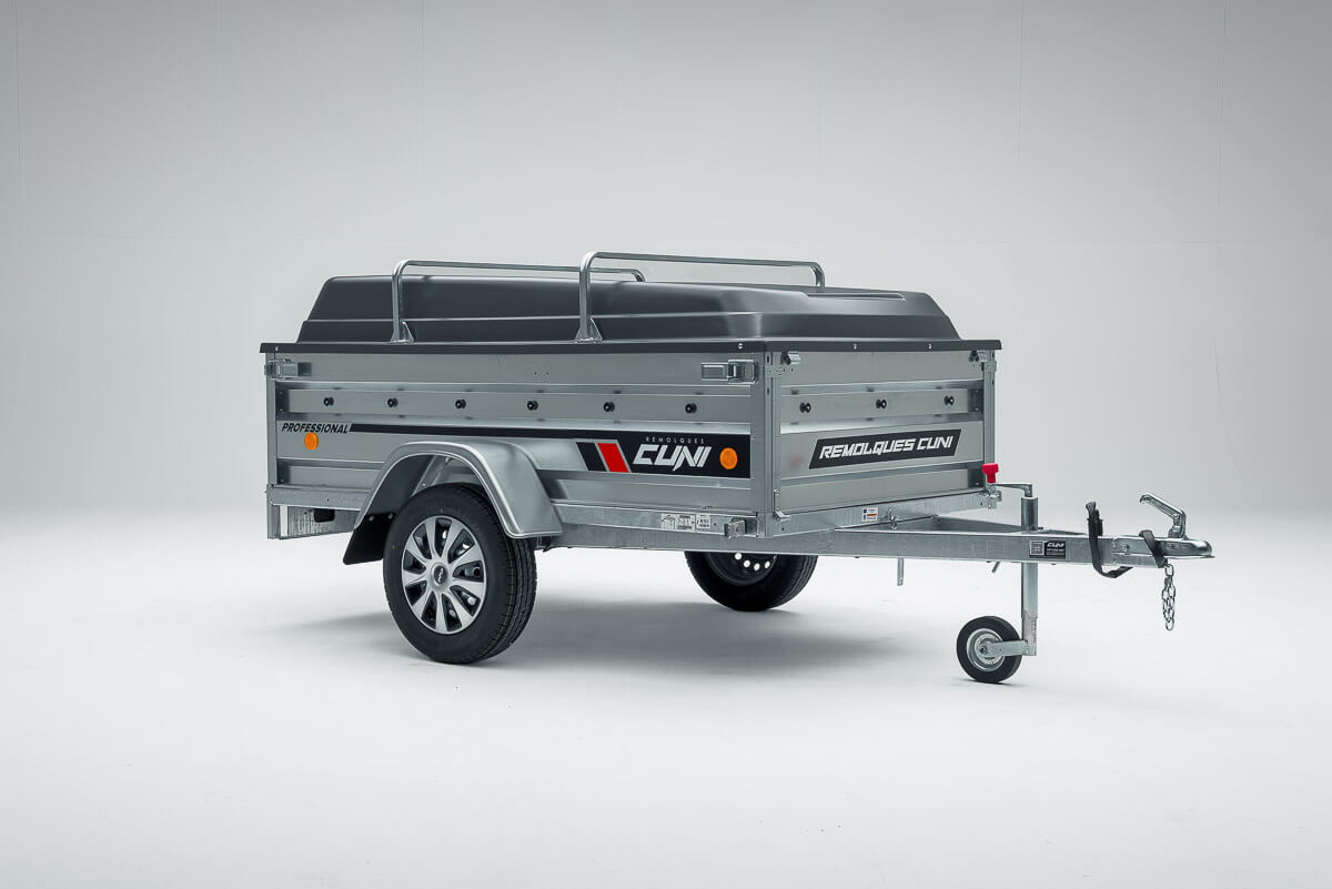Los remolques de carga profesional CUNI están diseñados para poder transformarlos en una pequeña plataforma. Tan solo necesitas desmontar los laterales y las puertas, y podrás cargar pequeña maquinaria o, incluso, un quad. Bajar y subir tu carga será muy fácil, solo necesitas bascular la caja. Puedes amarrarla desde los 4 anclajes que lleva fijados en el suelo.