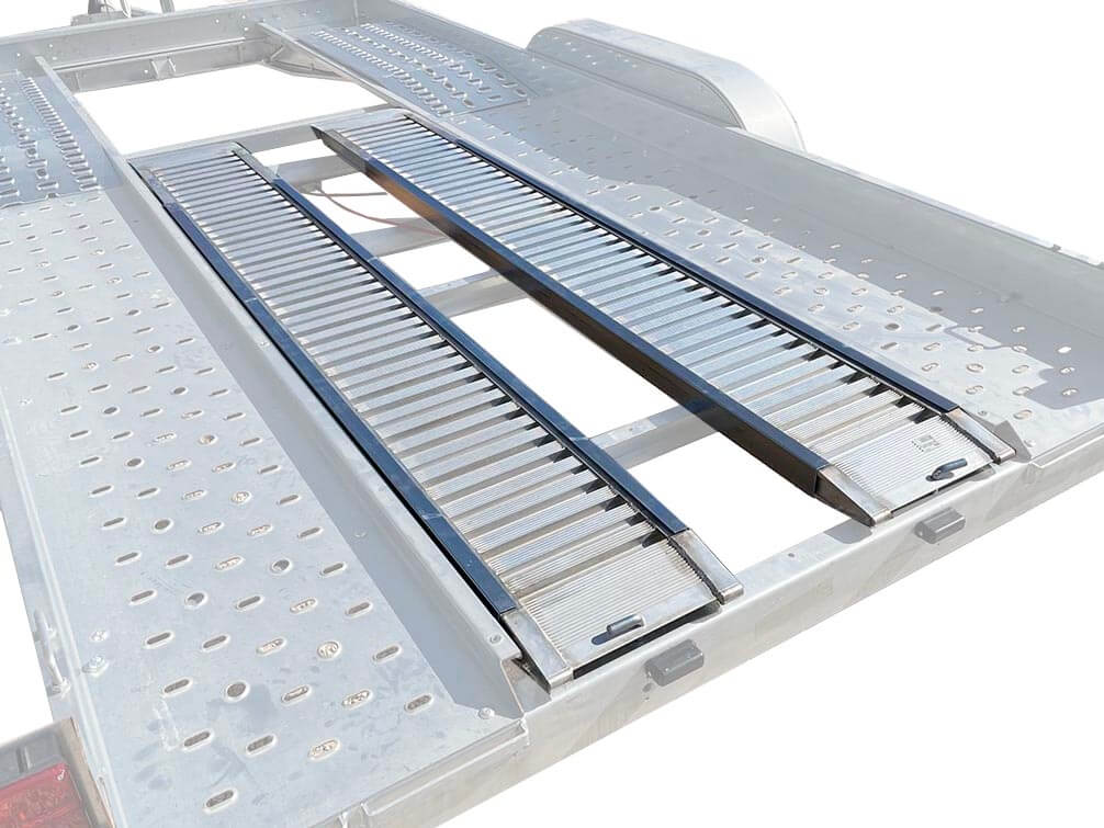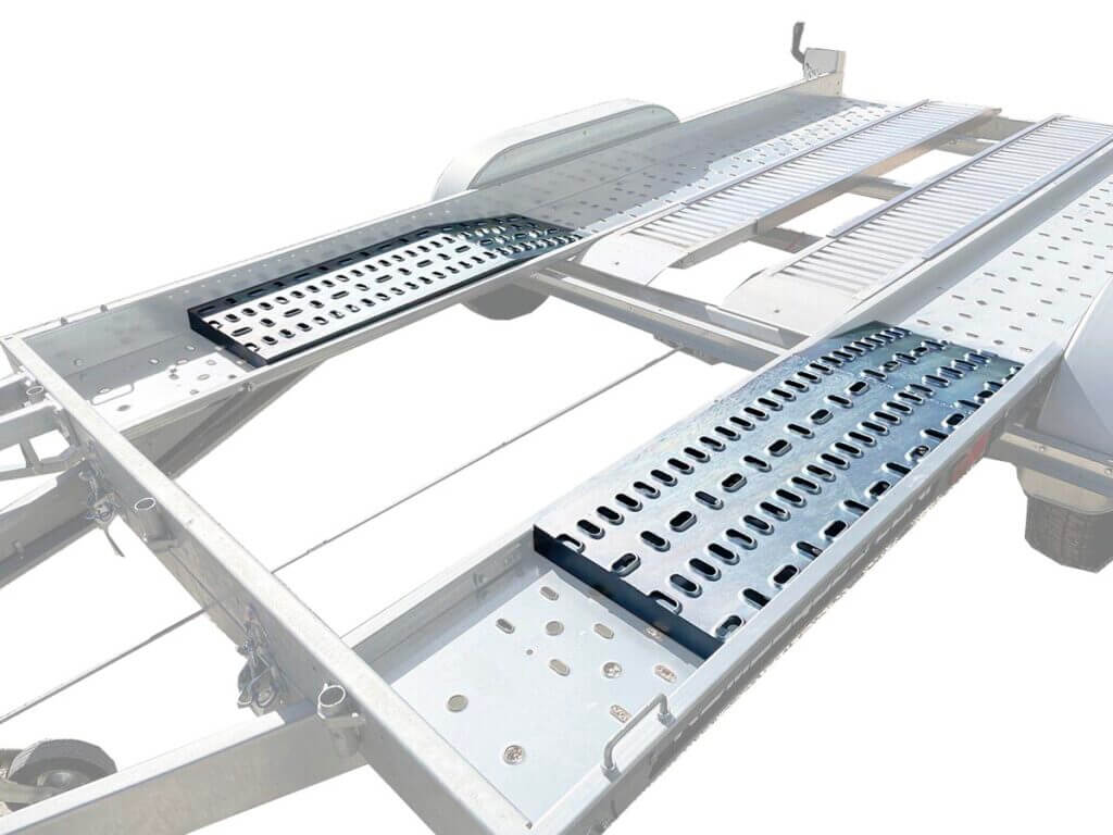 También está equipado con 2 rampas extraíbles de 120 x 43 cm, de 3mm de grosor y fabricadas en acero galvanizado. Las rampas cuentan con perforaciones en gravado a modo de antideslizante, y permiten la subida de un coche, si es alto, sin necesidad de basculación.