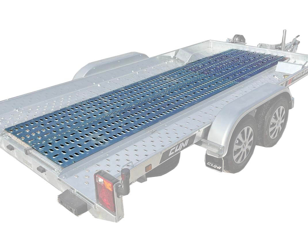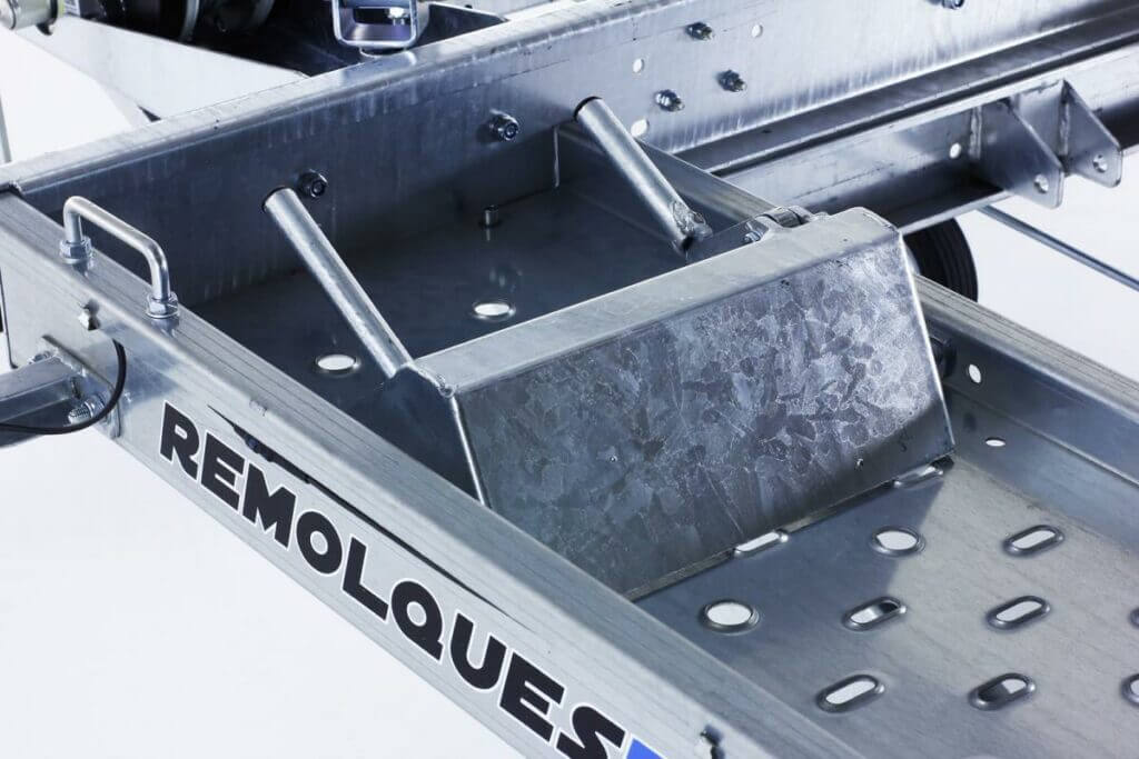 El JARAMA es un remolque más largo y fuerte que otros de su misma gama, capaz de transportar mucho peso con la mayor seguridad. Montados sobre un chasis de acero soldado y galvanizado en caliente, vienen 2 carriles fabricados con chapa perforada de 3 mm de grosor, de 394 cm de largo y con un ancho, cada uno de 46 cm, quedando un ancho central de 91 cm. Esto permite que puedas amarrar el coche con correas de ruedas.