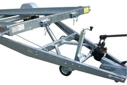 La basculación del remolque JARAMA funciona liberando los 2 mecanismos de seguridad y levantando la plataforma. El sistema está controlado por 2 resortes de gas que aportan una secuencia de movimientos que te resultará mucho más fácil de manejar. Este modelo consigue, gracias a su sistema de basculación, una inclinación de un 14 % y, añadiéndole las rampas de 1,20 m, se logra una pendiente todavía más suave para la carga de deportivos bajos. También ofrece la opción de basculación hidráulica.