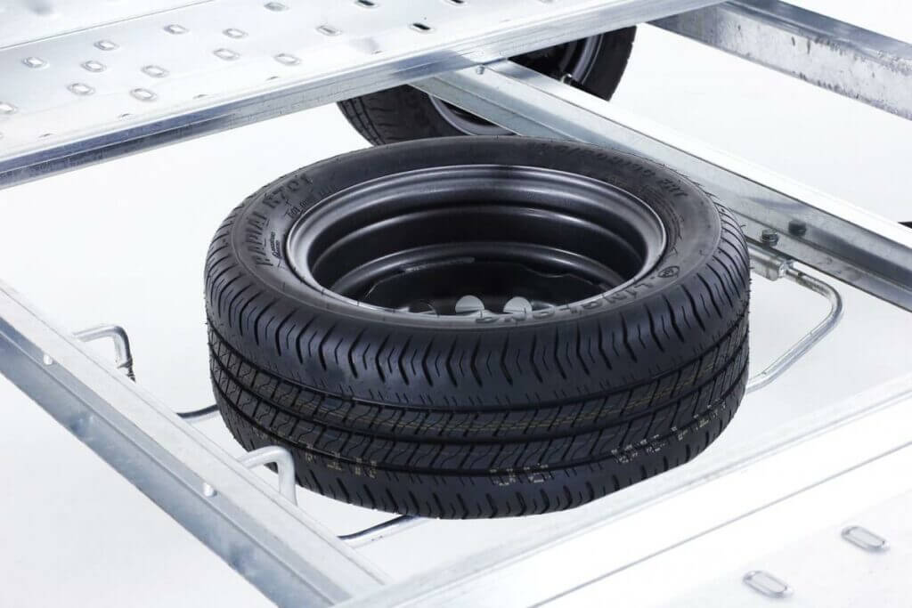 El portavehículos JARAMA está provisto con 2 ejes KNOTT de 1300 kg cada uno, una prestación que le proporciona un mayor punto de apoyo y de equilibrio y una capacidad de carga de hasta 1950 kg. Sus 4 ruedas de 165 R13C consiguen una mayor adherencia y, al ser exteriores, en lugar de estar instaladas debajo del remolque, reduce en altura y lo convierte en un modelo muy estable.